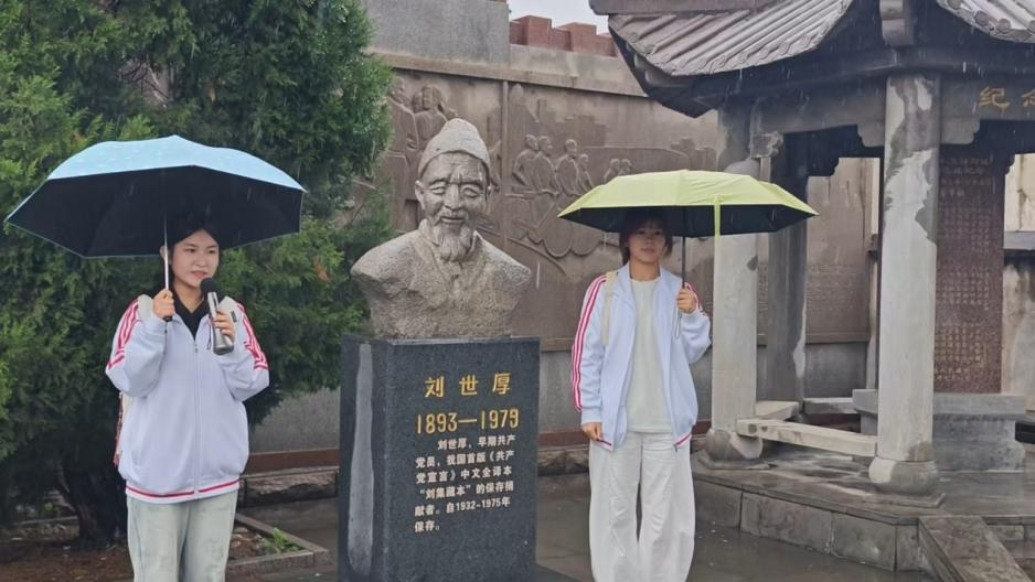 踏入舊址,首先映入眼簾的是劉子久與劉良才兩位烈士的雕像。右側(cè)是手握農(nóng)具、目光堅毅的“劉良才”,左側(cè)則是意氣風(fēng)發(fā)、手持《共產(chǎn)黨宣言》的“劉子久”。藥學(xué)二班的兩位同學(xué)擔(dān)任起臨時講解員,向同學(xué)們深情講述他們投身革命、英勇斗爭的光輝事跡。