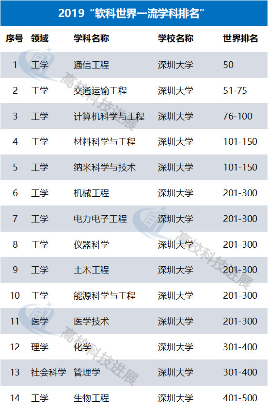在6月26日軟科正式發(fā)布2019“軟科世界一流學(xué)科排名”中,深圳大學(xué)有14個(gè)學(xué)科入選。