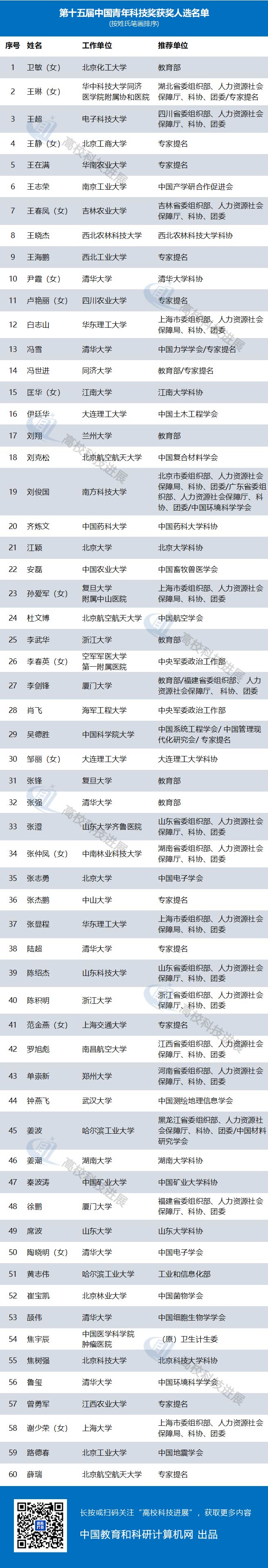 在100位獲獎(jiǎng)的科技工作者中有66位來(lái)自高校,其中6位高??萍脊ぷ髡攉@第十五屆中國(guó)青年科技獎(jiǎng)特別獎(jiǎng)項(xiàng),分別是天津大學(xué)鞏金龍、北京大學(xué)關(guān)啟安、北京大學(xué)第一醫(yī)院楊莉、哈爾濱工業(yè)大學(xué)吳曉宏、西安交通大學(xué)趙立波、北京航空航天大學(xué)魏新國(guó)。