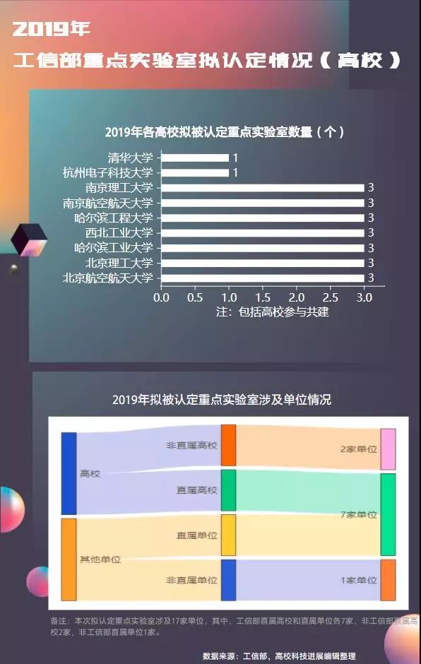 2019年,工信部擬認(rèn)定的重點(diǎn)實(shí)驗(yàn)室數(shù)量為30個(gè),其中,清華大學(xué)、杭州電子科技大學(xué)和“國(guó)防七子”高校等9所高校共有23個(gè)實(shí)驗(yàn)室被認(rèn)定為重點(diǎn)實(shí)驗(yàn)室,數(shù)量占比達(dá)到76.7%。