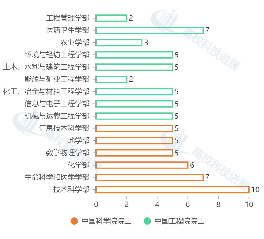 從學部分布來看,中國科學院共分6個學部,數(shù)學物理學部11人(高校5人),化學部10人(高校6人),生命科學和醫(yī)學學部10人(高校7人),地學部11人(高校5人),信息技術(shù)科學部7人(高校5人),技術(shù)科學部15人(高校10人)。