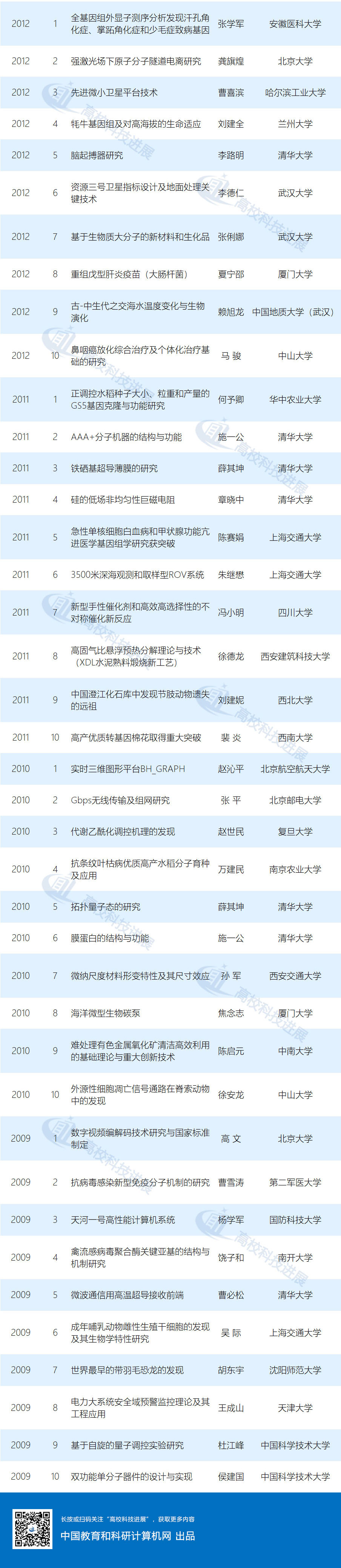 又是一年將過眼,根據(jù)往年的慣例,2019年度“中國高等學(xué)校十大科技進展”入選項目名單將會在本月底揭曉。我們拭目以待的同時,先來看看2009-2018年這十年里,有哪些高校的項目成功入選“中國高等學(xué)校十大科技進展”。