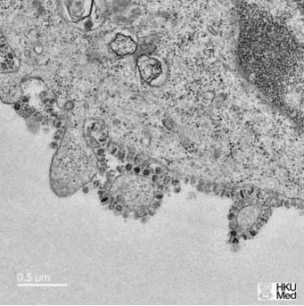 ▲香港大學(xué)電子顯微鏡圖像顯示了在細(xì)胞中生長的新型冠狀病毒。