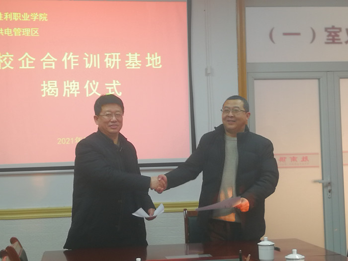 2021年1月20日,山東勝利職業(yè)學(xué)院與勝利電力分公司勝南供電管理區(qū)舉行《校企合作訓(xùn)研基地》揭牌儀式。學(xué)院副院長(zhǎng)王吉坡、培訓(xùn)學(xué)院書(shū)記李德儉、培訓(xùn)學(xué)院院長(zhǎng)明光和管理區(qū)經(jīng)理李海寶、副經(jīng)理蔣濤、賀俊峰等領(lǐng)導(dǎo)班子成員參加了揭牌儀式。