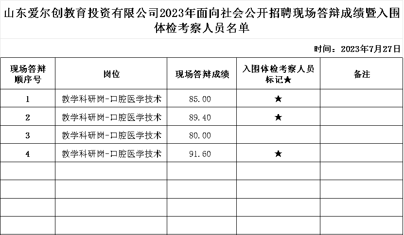 山東愛爾創(chuàng)教育投資有限公司2023年面向社會公開招聘現(xiàn)場答辯成績暨入圍體檢考察人員公告
