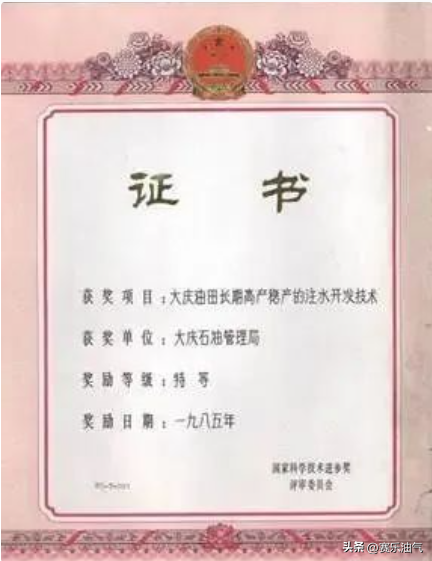 1985年,水驅(qū)(注水開發(fā)技術(shù))獲得國家科技進步特等獎,完成單位是大慶石油管理局(大慶油田)。突出貢獻者是王德民教授(后來成為院士)。其他獲獎者不詳,歡迎讀者補充。