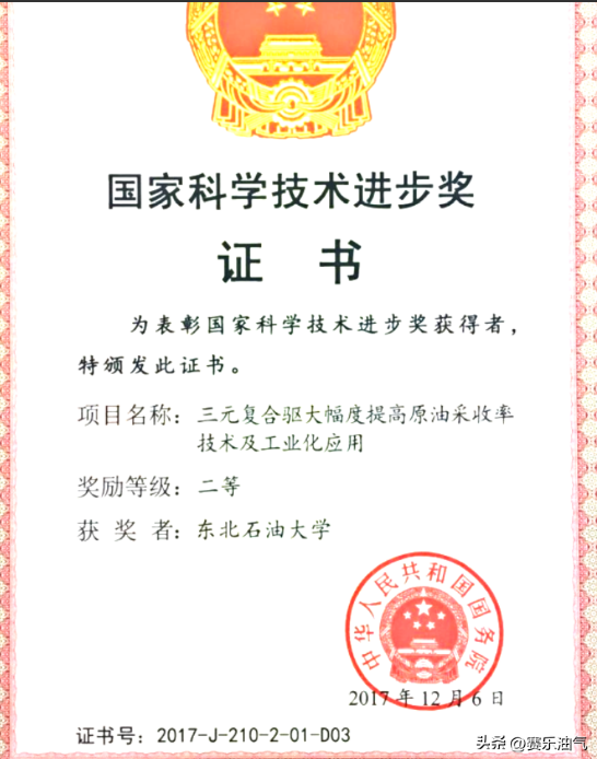 大慶油田三元復合驅(qū)獲得2017年國家科技進步二等獎,獲獎題目是【三元復合驅(qū)大幅度提高原油采收率技術(shù)及工業(yè)化應用】,牽頭人是大慶油田程杰成教授(目前已經(jīng)成為院士)。