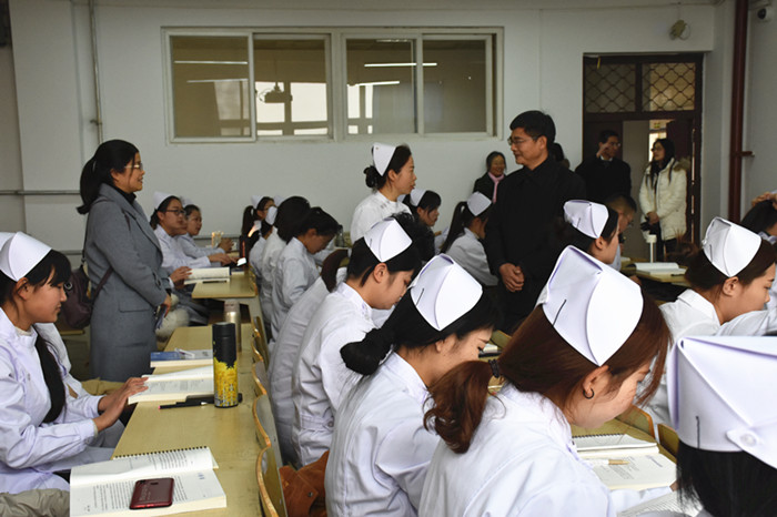 他們一起走進一間間教室,學生們個個精神飽滿,整齊入座,護理4班全體同學根據(jù)課程要求,統(tǒng)一著護士服、帶護士帽,展現(xiàn)出朝氣蓬勃的職業(yè)素養(yǎng);授課教師也早已在教室候課。課前的幾分鐘里,有的老師在調(diào)試設(shè)備,有的在與學生們熱情地交流著;醫(yī)療衛(wèi)生學院的全體班主任和化學工程學院的班主任早早來到教室督促學生們做好課前準備。學院所有班級均到課情況良好,多媒體教室和機房設(shè)備全部運行正常。在緊張有序的學習氣氛中,新學期教學工作正式開啟。