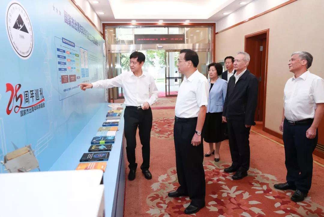 會(huì)前,在通往國務(wù)院第一會(huì)議室的走廊上,李克強(qiáng)和國務(wù)院其他幾位領(lǐng)導(dǎo)參觀了國家杰出青年科學(xué)基金25周年巡禮展。