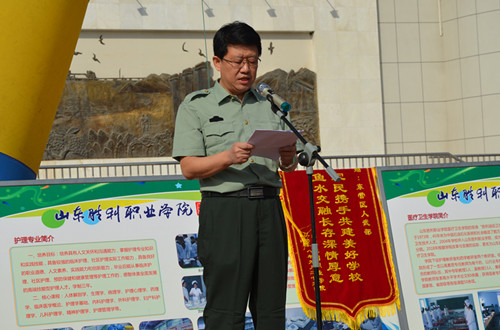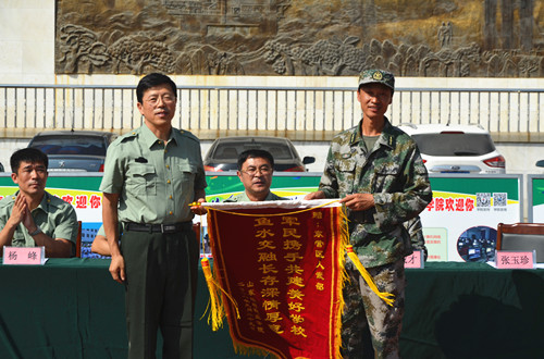 學院黨委副書記、院長張玉珍向東營區(qū)人武部贈送錦旗。