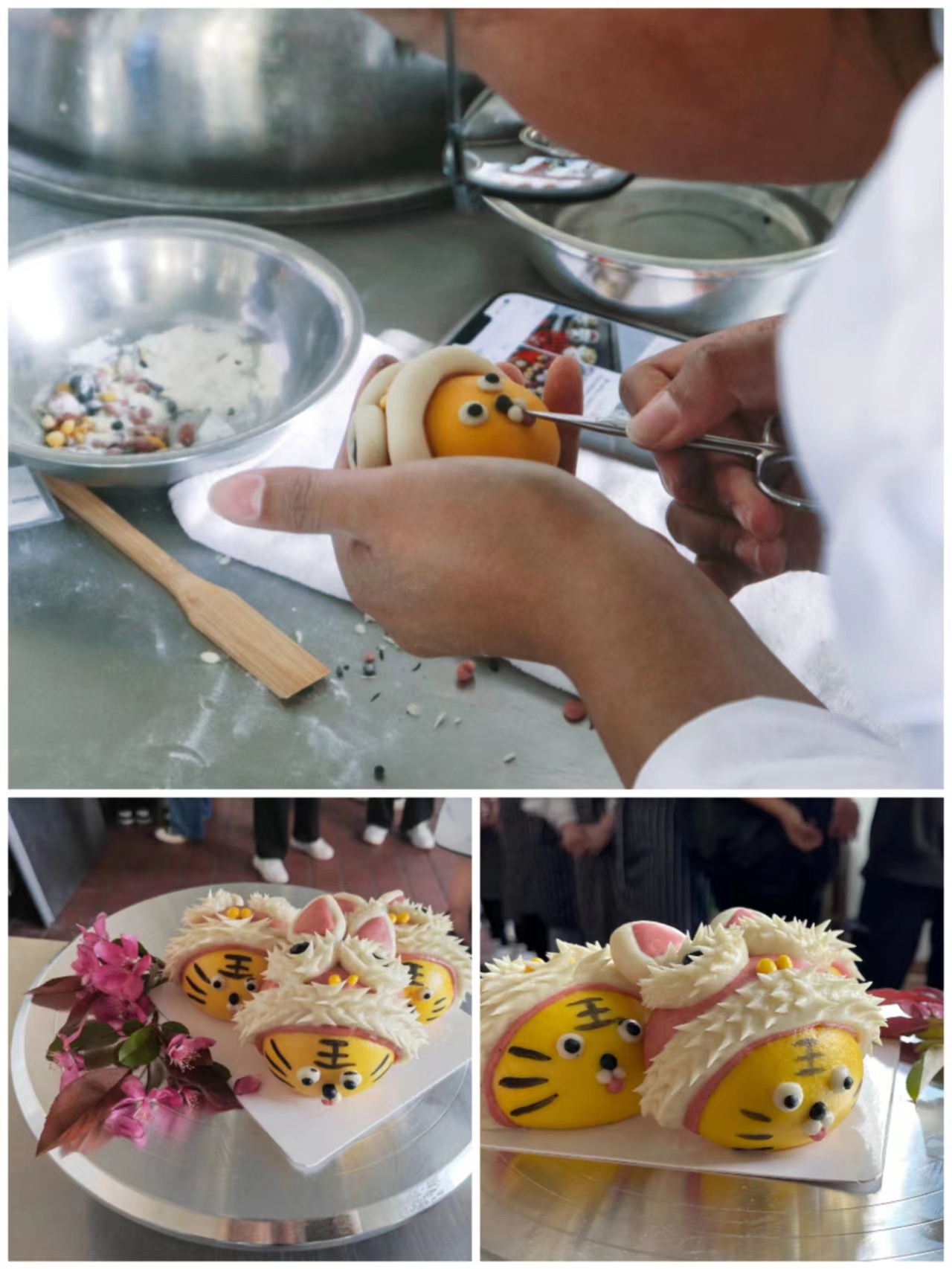 參賽同學(xué)從揉面、加工到色彩的搭配,再到烤制時(shí)間的精準(zhǔn)把控,無一不展現(xiàn)了選手的精湛技藝,最后呈現(xiàn)出醒獅虎、春日桃花酥、山楂鍋盔等精美作品。整場比賽活動規(guī)范有序進(jìn)行,學(xué)生們在規(guī)定時(shí)間內(nèi)完成競賽任務(wù),同時(shí)時(shí)刻關(guān)注儀容儀表、臺面衛(wèi)生,現(xiàn)場操作素質(zhì)良好。經(jīng)過激烈的角逐,22級參賽同學(xué)制作的醒獅虎脫穎而出。醒獅虎可愛而又精致的造型以及香甜的口感打破了許多人對傳統(tǒng)山東花饃的刻板印象,博得現(xiàn)場評委一致好評。