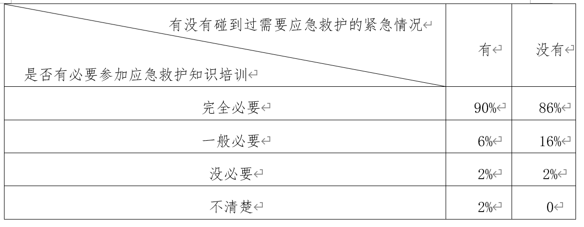 (5)生產(chǎn)一線員工對(duì)應(yīng)急救護(hù)知識(shí)的培訓(xùn)經(jīng)歷通過(guò)調(diào)查顯示:碰到過(guò)應(yīng)急救護(hù)緊急情況的生產(chǎn)一線員工愿意學(xué)習(xí)應(yīng)急救護(hù)知識(shí)的比例遠(yuǎn)遠(yuǎn)高于沒(méi)有碰到過(guò)此類情況的員工。經(jīng)歷意外事件后,往往能親身體會(huì)緊急情況下掌握應(yīng)急救護(hù)知識(shí)的重要性。