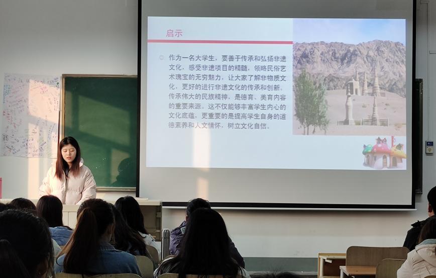 活動起始,由班委代表團(tuán)支書趙艷文同學(xué)以介紹石窟藝術(shù)的寶庫——敦煌莫高窟為例開展宣講。通過介紹其歷史淵源、洞窟藝術(shù)魅力,生動的詮釋了莫高窟的形象藝術(shù)。其次,崔涵智等學(xué)生分別以南方的湘繡和北方的京劇為例,介紹了南方與北方不同的非物質(zhì)文化遺產(chǎn),并通過播放生動的視頻,讓學(xué)生們身臨其境的感受到了南北方手工藝者的的傳承精神與工匠精神,體會到了中華傳統(tǒng)文化的藝術(shù)魅力。同時,學(xué)生們還意識到保護(hù)和推廣非物質(zhì)文化遺產(chǎn),對于帶動當(dāng)?shù)靥厣?jīng)濟(jì)的發(fā)展也大有益處。學(xué)生們利用生動的演講,結(jié)合制作精美的PPT,開展了一次有意義的非物資文化遺產(chǎn)保護(hù)與宣講活動。