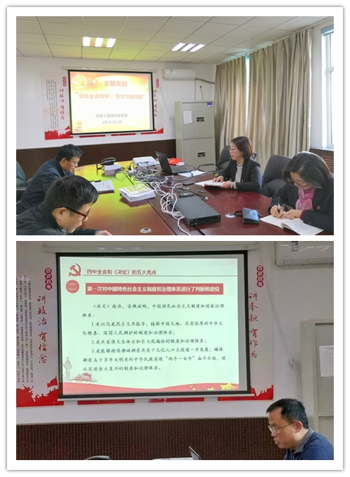 為深入貫徹學(xué)習(xí)黨的十九屆四中全會(huì)精神,11月28日上午,機(jī)電工程學(xué)院黨支部在致知樓208開展了以“領(lǐng)會(huì)全會(huì)精神、筑牢黨建根基”為主題的11月份主題黨日活動(dòng)。
