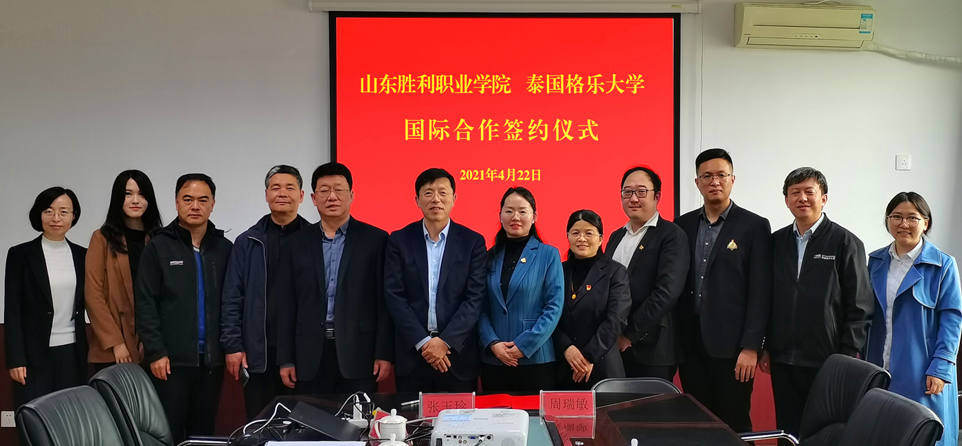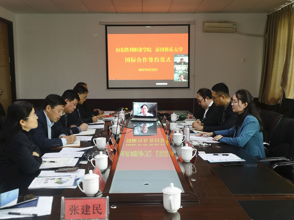 2021年4月22日下午,為了響應中國政府提出的“一帶一路”倡議,加強東盟核心國-泰國同中國在教育、文化領域的交流,泰國格樂大學王長明主席(線上)、周瑞敏副院長等相關領導與山東勝利職業(yè)學院院長張玉珍、副院長孫衛(wèi)娟等相關領導進行洽談會議。