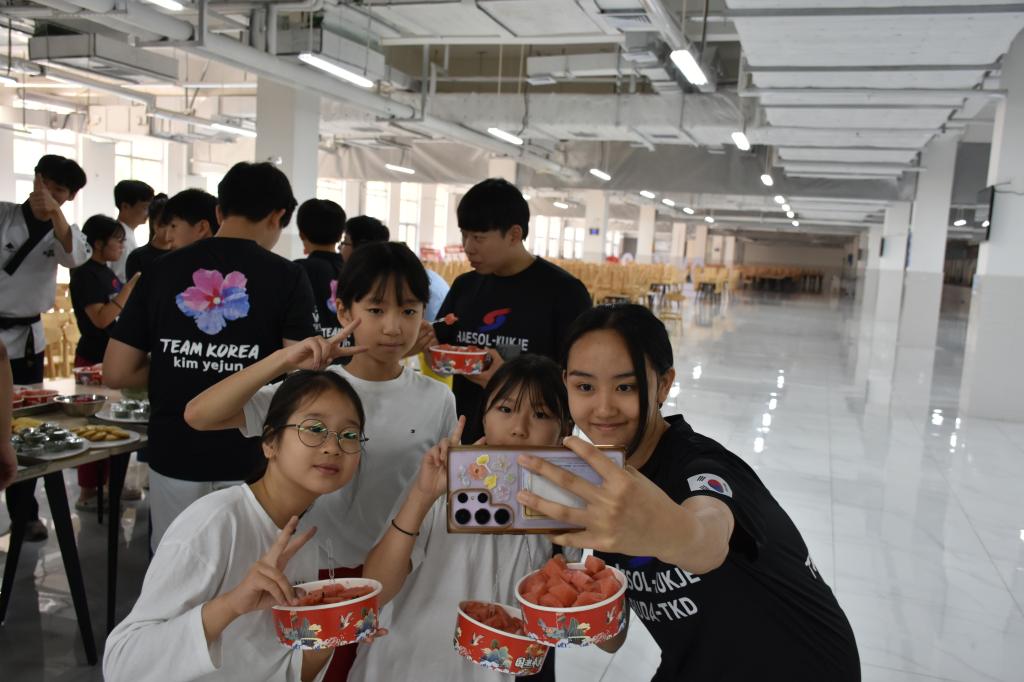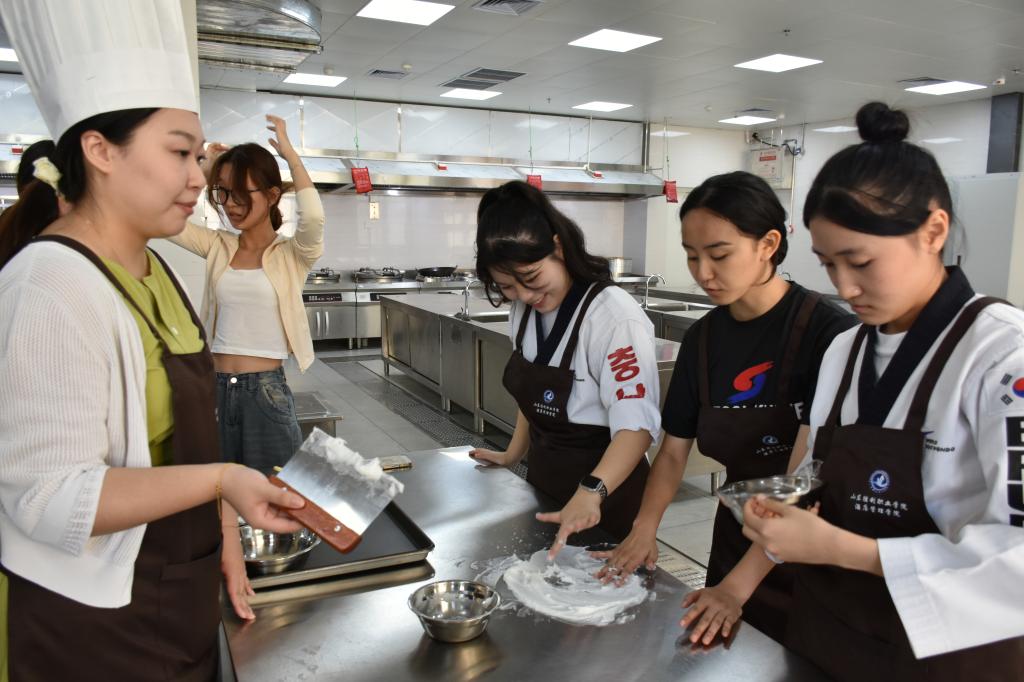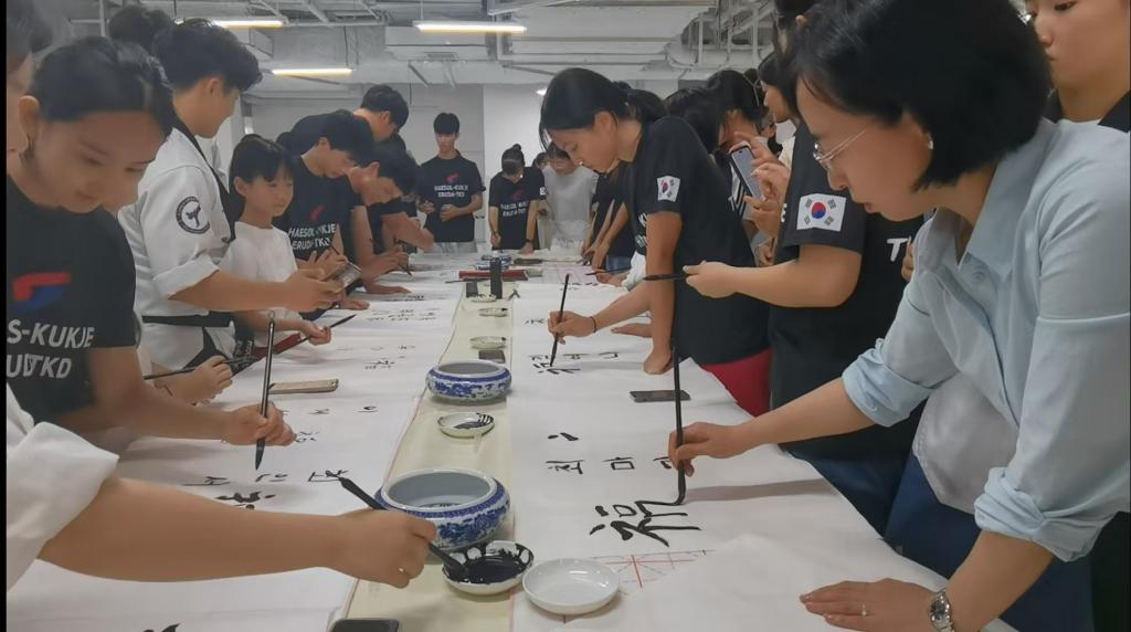 活動中,韓國青少年首先獻(xiàn)上了精彩的跆拳道表演,剛勁有力的動作贏得陣陣掌聲。隨后,在書法協(xié)會同學(xué)的悉心指導(dǎo)下,韓國青少年體驗了書法藝術(shù),認(rèn)真臨摹"福"字,感受漢字的文化魅力?;迎h(huán)節(jié)中,中方學(xué)生還將親手制作的書法扇子和精美書簽贈予韓國友人。在面點制作體驗中,學(xué)院專業(yè)面點教師現(xiàn)場指導(dǎo)韓國青少年制作中國傳統(tǒng)點心桃酥,活動還特別準(zhǔn)備了清甜可口的西瓜等消暑美食,大家在歡聲笑語中拉近了距離。