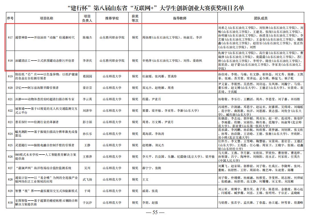 近日,第八屆山東省“互聯(lián)網(wǎng)+”大學(xué)生創(chuàng)新創(chuàng)業(yè)大賽(以下簡稱“互聯(lián)網(wǎng)+”大賽)落下帷幕,來自全省147所高校的45萬個(gè)項(xiàng)目、200多萬名學(xué)生同臺(tái)競技。經(jīng)過激烈角逐,我?!队凸耷鍧嵐ぁ⑹焦绊敼揲_創(chuàng)者》和《通管神器—開創(chuàng)油田“動(dòng)脈”檢通新時(shí)代》2項(xiàng)目斬獲職教賽道銅獎(jiǎng),實(shí)現(xiàn)我校在“互聯(lián)網(wǎng)+”大學(xué)生創(chuàng)新創(chuàng)業(yè)大賽獎(jiǎng)項(xiàng)上零的突破。