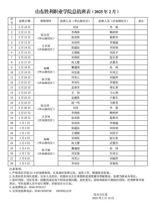山東勝利職業(yè)學(xué)院2月份值班表