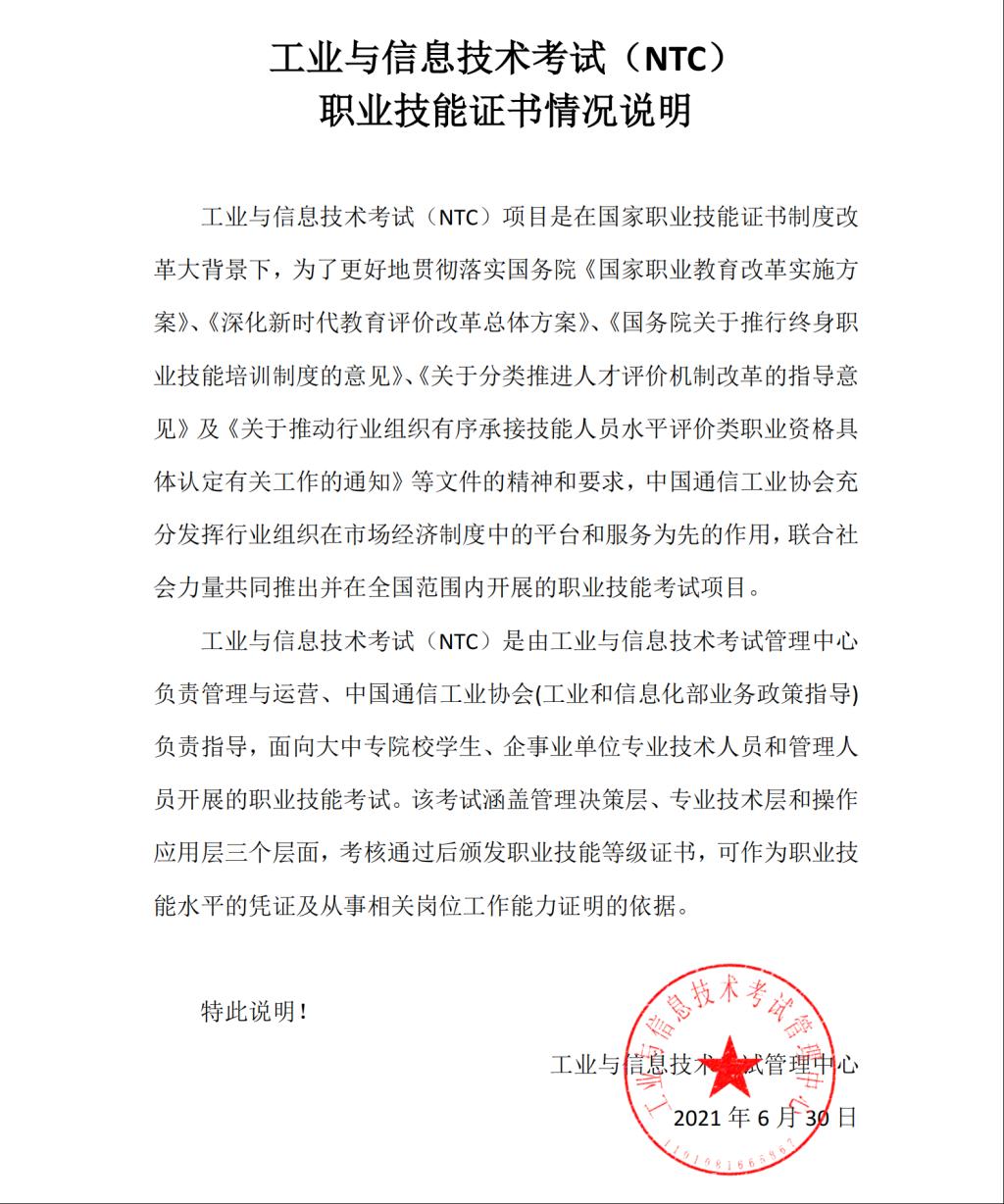 “工業(yè)與信息技術(shù)考試(NTC)”是面向大學(xué)在校生以及企事業(yè)單位專業(yè)技術(shù)人員和管理人員開展的職業(yè)技能考試??己送ㄟ^后頒發(fā)職業(yè)技能證書,作為職業(yè)技能的憑證以及從事相關(guān)崗位的任職依據(jù)。該證書終身有效,通用度高,實(shí)用性強(qiáng),以就業(yè)為導(dǎo)向,企事業(yè)單位用人的重要標(biāo)準(zhǔn),為考試者提供強(qiáng)有力的擇業(yè)市場競爭優(yōu)勢。