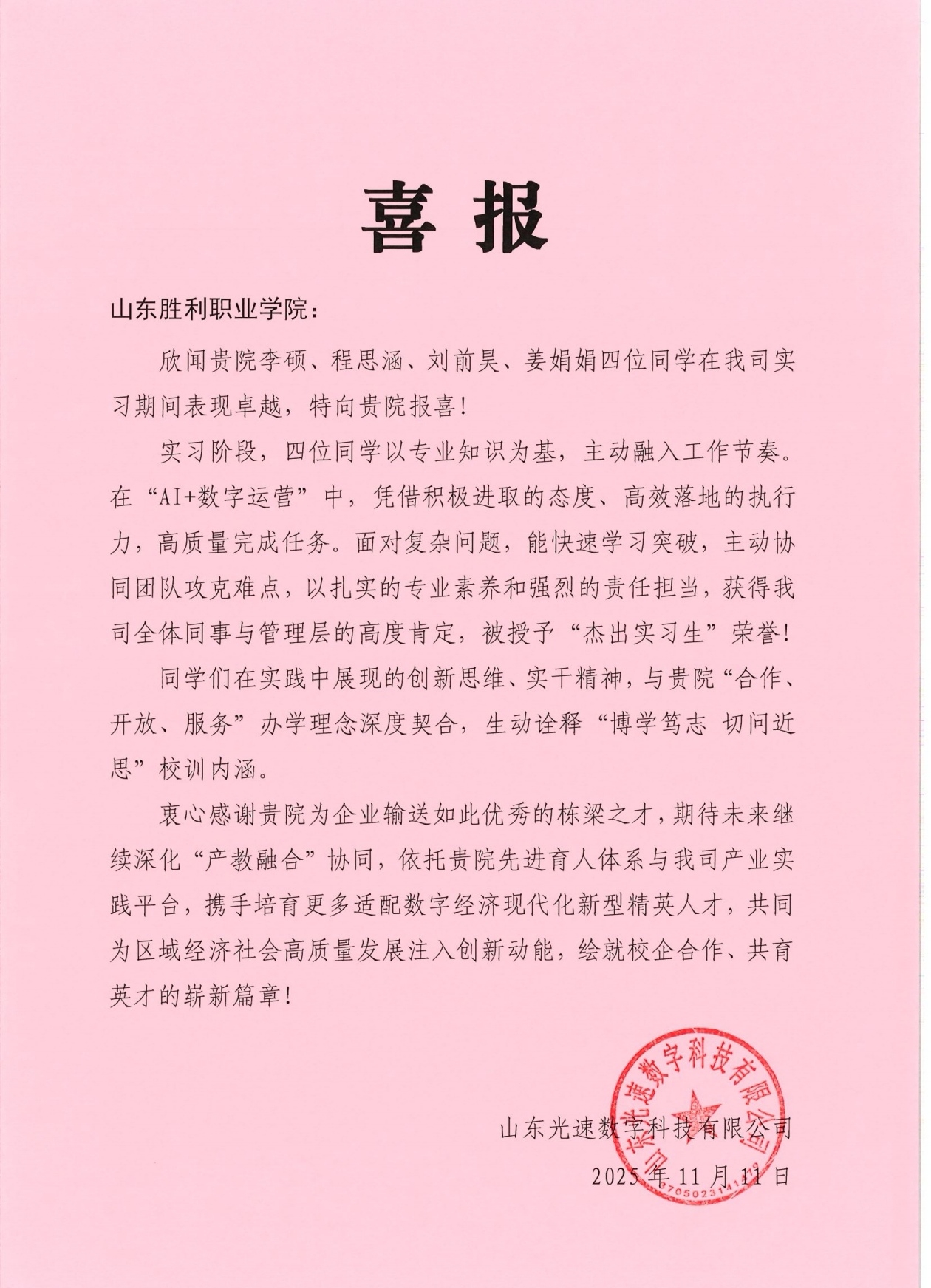 近日,智能制造學院23級多名實習學生憑借扎實的專業(yè)功底和出色的工作表現(xiàn),獲得合作企業(yè)的一致好評。企業(yè)通過感謝信、喜報等形式,對學生在崗位上的表現(xiàn)給予充分肯定。
