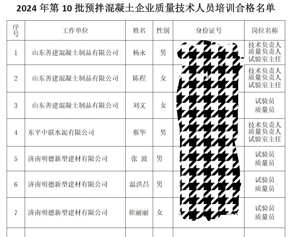 2024年第10批預(yù)拌混凝土企業(yè)質(zhì)量技術(shù)人員培訓(xùn)合格名單