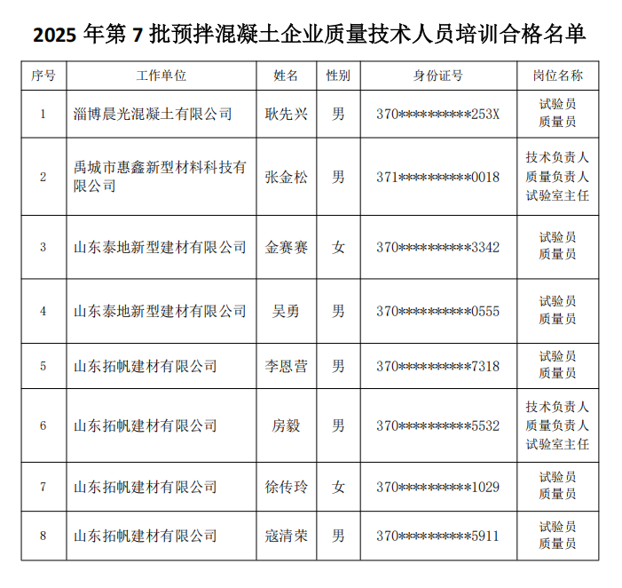 2025年第7批預(yù)拌混凝土企業(yè)質(zhì)量技術(shù)人員培訓(xùn)合格名單